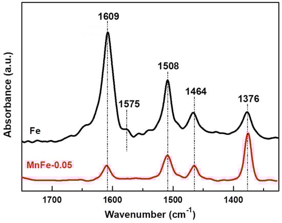 FTIR spectra of pyridine adsorbed at 100 °C for pure Fe and MnFe-0.05 catalysts. The reduction in the samples was performed at 450 °C for 1.5 h with a heating ramp of 5 °C/min.