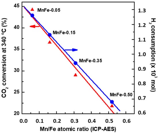 TPR results (Figure 4A) indicate that the formation of small crystals of Fe2O3 phase facilitates the reducibility of iron species. Interestingly, an increase in the Mn content in the Fe catalysts led to a simultaneous decrease in both H2 consumption during reduction in iron phases and CO2 conversion (Figure 14). This fact is indicative of a relationship between the CO2 conversion and the reducibility of Fe2O3 species. If we consider the presence of the Fe2+ species as an indicator of the reducibility of the iron species, the MnFe-0.05 and bare Fe samples displayed the highest and lowest reducibility of Fe2+ species, respectively (Table 5). Therefore, the best catalytic behavior of MnFe-0.05 could be associated with the easier transformation of Fe2O3 to χ-Fe5C2 active phase needed for the FT synthesis [62]. Taking into account that the reduction from CO2 to CO occurs on the iron oxides and that the bare Fe catalyst contains the largest amount of both Fe2O3 and Fe3O4 (from XPS, Table 6), the bare Fe catalyst has better conditions for the CO formation via RWGS reaction than the Fe-0.05 catalyst, as it is confirmed by its largest YCO/YHC ratio (Figure 9A).