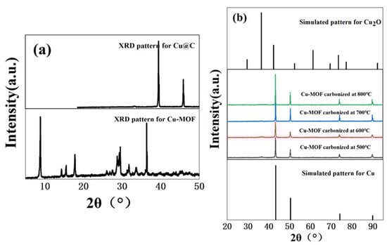 The hydrothermal reaction of copper ions (Cu2+) with BDC, EtOH, and H2O in DMF formed a bright blue precipitate. Then, we used XRD to verify the crystallinity of the bright blue precipitate. Based on the sharp diffraction peak in the XRD pattern (Figure 1a) of Cu–MOF, we found that the material had high crystallinity. As a precursor, Cu–MOF was then carbonized at 500 °C, 600 °C, 700 °C, and 800 °C and the XRD patterns showed the characteristic peaks of two phases, namely Cu0 (JCPDS Card No. 04-0836) [27] and Cu2O (JCPDS Card No. 05-0667) [28,29] (Figure 1b). However, the phase of Cu2O was not obvious and according to the results of XRD patterns, we inferred that the main form of Cu in the carbonized Cu–MOF was Cu0. Unfortunately, no single crystal could grow from the synthesized Cu–MOF after all attempted measures in this work, and the accurate data and structure of the single crystal could not be obtained.