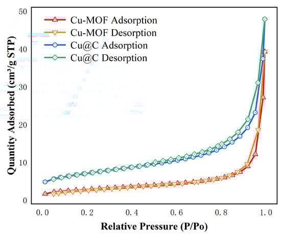 The surface area and pore size were analyzed using the N2 adsorption/desorption isotherms (Figure 2 and Figure S1). The images showed that the adsorption behaviors of Cu–MOF and Cu@C conformed to type II N2 adsorption isotherms with type H3 hysteresis loops, as classified by IUPAC [30]. This indicated that the materials were not porous, but rather mesoporous materials consisting of slits resulting from the aggregates of the layered structures. The BET surface area, average pore diameter, and total pore volume are listed in Table 1. After the carbonization of Cu–MOF, the BET surface area and pore volume increased, while the pore size decreased. As the initial skeleton was carbonized, a portion of the structure collapsed, resulting in the formation of the Cu@C catalyst structure, which released more surface and the formation of Cu nanoparticles. Therefore, the surface area and pore volume increased. Additionally, the decrease in pore size indicated that the amount of pores increased after calcination.