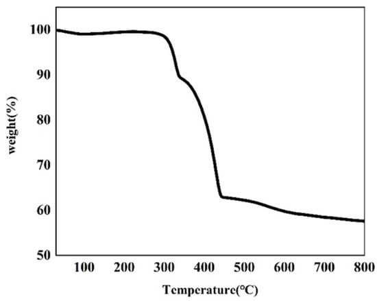 Thermogravimetric analysis of the as-made Cu–MOF material was conducted (Figure 3 and Figure S2). According to the TGA plot of Cu–MOF, two major weight-loss steps were observed. The first major weight-loss step occurred at 260 °C and reached an inflection point at 348 °C, and a total of 10.50% of the mass was lost in this process. This mass loss was possibly due to the decomposition of DMF, EtOH, and H2O covalently bound to Cu(II). Another major weight loss value of 26.31% was observed after a brief heat-up reached approximately 354 °C. This indicated that the departure of the ligand molecules led to the collapse and disassembly of the MOF backbone after 354 °C, and this process continued until 450 °C. A subsequent mass loss of 5.16% up to 800 °C was due to the departure of the remaining ligand molecules and the continuing collapse of the framework. This also indicated that the residual mass of the final metallic copper (Cu0) and Cu2O products in carbon sheets was 57.61%.