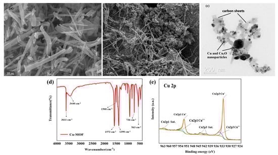 (a) SEM image of Cu–MOF, (b) SEM image of Cu@C (700 °C) and (c) TEM image of Cu@C (700 °C), (d) FT-IR of Cu–MOF, and (e) XPS of Cu@C.