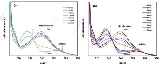 Currently, one of the most commonly used methods to reduce nitro compounds involves using sodium borohydride (NaBH4) as the reducing agent [34]. However, due to the low chemical activity of nitrobenzene, reducing nitrobenzene directly with NaBH4 is difficult, and, as a result, this reaction must be assisted by an appropriate catalyst. Therefore, to evaluate the catalytic activity of the prepared Cu–MOF and Cu@C, these materials were tested by the reduction reaction with nitrobenzene as the reactant and NaBH4 as the reducing agent, and ethanol was chosen as the solvent in the reaction system. This process was monitored using UV–vis absorption spectroscopy. Visually, when the catalyst was added to the reaction solution, many bubbles were immediately produced. As the reaction continued, the solution with Cu@C changed from colorless to a pale-yellow color to colorless again; however, the solution with Cu–MOF became cloudy. According to the UV–vis spectrum of the solution with Cu@C, the absorption peak of nitrobenzene (260 nm) decreased continuously, while the peak of aniline (281 nm) increased (Figure 5). However, because the characteristic peak of nitrobenzene completely covered the peak of aniline, this change was reflected by the change in the peak curve near 235 nm, and the reduction reaction was completed in only 8 min (Figure 5b). In the other Cu–MOF group, the curve changes were interesting (Figure 5a). During the first 20 min, the concentration of nitrobenzene barely changed; however, after 20 min, its concentration decreased rapidly. Due to the quantity of bubbles produced after adding Cu–MOF, we performed a control test, which consisted of adding Cu–MOF under the same conditions but without the addition of nitrobenzene. We observed that many bubbles were still produced and the solution became cloudy. Soon, some black solids appeared on the bottom of the tube. Therefore, we concluded that the uncalcined Cu–MOF could be reduced by NaBH4, and it showed no obvious catalytic activity for the reduction of nitrobenzene. Only when the Cu–MOF was transformed to the black solids by NaBH4 did the exposed metal active center show high catalytic activity for the reaction. We then conducted two additional check tests, which confirmed the high catalytic performance of Cu@C. As previously stated, it was difficult for NaBH4 to reduce nitrobenzene without a catalyst, and this was confirmed by the test where we added only NaBH4 to the solution; the concentration of nitrobenzene was almost unchanged (Figure 6a). In addition, Cu@C without NaBH4 was studied (Figure 6a). The concentration of nitrobenzene decreased with time, but its concentration increased slightly at 20 min. This was due to the adsorption of Cu@C on nitrobenzene, indicating that adsorption equilibrium was reached after 20 min.