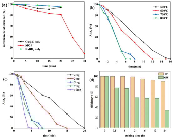 (a) Reduction of nitrobenzene with Cu–MOF instead of Cu@C, Cu@C without NaBH4, and NaBH4 without Cu@C; the effects of (b) carbonization temperature, (c) the amount of Cu@C, and (d) the etching times of H2SO4 and NaOH.