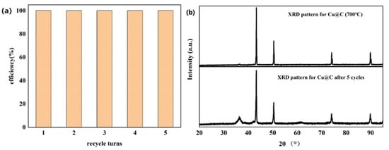 The recyclability of Cu@C was also studied (Figure 7a), with a total number of five experimental cycles. According to the experimental results, catalytic performance did not decrease after five cycles without any reactivation or catalytic post-treatment. Moreover, after each cycle, the end of the reaction (end of bubble production) was slightly faster than in the previous cycle. This meant that the catalyst became more active after each cycle. We speculated that the catalyst further exposed the originally unexposed catalytic active sites after the reaction, further improving catalytic efficiency [44]. The XRD pattern of Cu@C after cycling was investigated (Figure 7b), and the pattern showed that after five cycles, there were no obvious changes in Cu@C. The peak related to Cu2O was enhanced, possibly because after the reaction, the distribution of Cu and Cu2O became more uniform as opposed to a layered distribution. Moreover, the XRD pattern further confirmed that Cu@C had excellent recyclability.