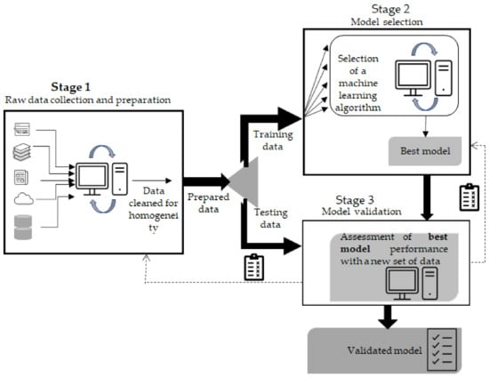 Schematics of the overall machine learning methodology considering the 3 stages involved. The first stage involves raw data collection and their cleaning. The cleaned data are split into two sets, one providing training data (Stage 2) and the other testing data (Stage 3). In the second stage, several algorithms are evaluated to find the one that best fits the matter at hand. In stage 3, the model selected in stage 2 is tested again with a new set of data to establish how it performs. Depending on the outcome, the model may require adjustments, so going back to previous stages may be required.