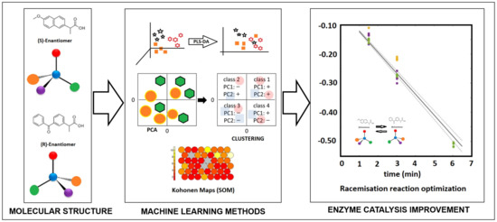 Enzyme immobilization, e.g., confinement of the enzyme in a restricted region of space, is known to potentiate the use of the enzyme, since it enhances stability and resistance to environmental factors, improves the control of the reaction and enables reusability [229]. However, despite being consistently used for several decades, enzyme immobilization is still vastly empiric, relying on tedious and time-consuming trial-and-error methodologies [230]. The use of rational design procedures is seen as a way to decrease the costs of immobilization protocols, but their implementation requires knowledge on several physical, chemical and biological variables related to the method of immobilization, the carrier and the enzyme itself and how to correlate these with output variables illustrative of immobilization efficacy, e.g., expressed activity, which is also known as activity recovery [230,231]. Thus, MLMs are an attractive way to deal with the vast combination of variables. MLMs can be used to retrieve information from databases that harbour information on enzyme structure and function and the physical–chemical features of carriers and infer key properties of the immobilized biocatalyst, e.g., activity and stability [232]. Additionally, MLMs can be used to process the huge number of data generated when a multidisciplinary approach combining physical–chemical and biological properties is used to determine the optimal immobilization procedure. Accordingly, Ralbovsky and Smith used multivariate analysis to process a complex dataset on pantothenate kinase immobilization into two commercial acrylamide- and methacrylate-based carriers that was generated through Raman hyperspectral imaging [205]. The latter can provide information on the chemicals involved in enzyme immobilization and their spatial distribution. Processing the image dataset with multivariate analysis and PCA allowed the researchers to identify and spatially resolve six diverse elements critical for the successful immobilization of the enzyme and to quantify the coverage of the surfaces by the enzyme. Ultimately, the authors proposed that the output variable quantitation of enzyme coverage can be used as a metric to evaluate enzyme immobilization. For the case study, the authors established that the acrylamide carrier allowed 1.3-fold higher enzyme coverage than the methacrylate carrier, hence rendering the former more effective for panthotenate kinase immobilization. The authors assumed that the often-observed correlation between enzyme loading and enzyme activity held, but no experimental validation was performed. Notwithstanding, the strategy presented provides a direct quantitative metric with which to evaluate enzyme immobilization efficacy. In a follow-up of this work, Ralbovsky and Smith established that the combined use of Raman hyperspectral imaging and PLS could be used to identify and classify samples of immobilized panthotenate kinase formulations. As an example, the set up developed allowed the identification of the carrier to which the enzyme was bound. The authors suggested that the work could be further expanded to identify and gain insight into how other carriers interact with the enzyme [233].