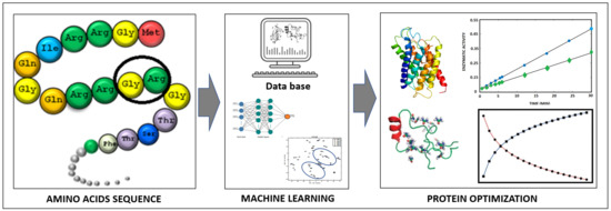 Protein engineering focuses on the modification of existing proteins through either changes in amino acids in the protein sequence, typically through replacement, insertion or deletion of nucleotides in the encoding gene, or the design of new proteins. Machine learning has also been used to assist directed evolution for protein engineering, allowing protein functions to be optimized with no requirement of prior knowledge of the underlying physics or the biological pathways [49]. Briefly, MLMs speed up directed evolution by gaining information on the properties, namely the sequence–function relationship, of thoroughly characterized proteins that are available in databases. Once an adequately accurate algorithm is selected to model the structure–function relationship, it is trained, so that the parameters are tuned to maximize its predictive capacity, and evaluated to assess its performance. Afterwards, model-based optimization can proceed for the selection of the sequence or sequences that optimize the function. For instance, models of the mutational effects can be used that ultimately classify the mutations as positive, negative or neutral, or the model may identify a combination of mutations with a high likelihood of improving the function (Figure 3). Thus, ML enables a shift from tedious, repetitive and costly wet-lab cycles of mutation/screening where the best variant in each cycle is selected and used in a new cycle until the intended goal is achieved, to a dry-lab environment, which is less demanding in terms of costs and resources [49,67,210,211,212].