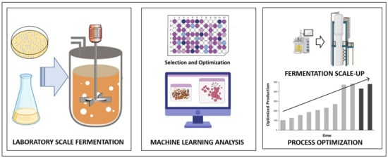 The optimization of microbial enzyme production has traditionally been performed with the one-factor-at-a-time approach (OFAT), which is time-consuming and fails to identify interactions among variables. Hence, it has been gradually replaced with statistically designed experiments, e.g., response surface methodology (RSM), where several factors are varied simultaneously using empirical multivariate models [218,219]. More recently, MLMs have been gaining relevance, namely to address situations where detailed insight into the process is missing or the formulation of the reaction mechanism is not feasible [219,220]. Thus, MLMs have been used to determine the correlation between operational (input) conditions (e.g., pH, temperature, substrate concentration and nature, flow rates) and (output) microbial metabolism (e.g., enzyme synthesis) and then predict the output for given inputs. This is typically carried out through supervised learning algorithms, whereas the identification of hidden underlying patterns in data, outlier detection and dimensionality reduction are left to unsupervised learning algorithms, which have been used for various applications, e.g., process control. Overall, the algorithms used enable the prediction of relevant output variables, e.g., enzyme yield, or the most adequate parameter for scaling up or down [2,31,95,221,222] (Figure 4).