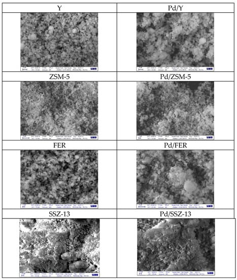 SEM (Scanning Electron Microscopy) images reported in Figure 2 clearly show the maintenance of the zeolite morphologies also after Pd addition; moreover, the associated energy-dispersive X-ray (EDX) analysis confirms the Si/Al ratio given by the supplier and the Pd loading near the nominal value (1 wt%, see Table 1). Pd loading has also been confirmed by ICP-MS analysis in the case of the SSZ-13 sample.