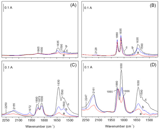 FT-IR spectra of NO (2 mbar, curves a—red) adsorbed at RT on activated Pd/Y (A), Pd/ZSM-5 (B), Pd/FER (C), and Pd/SSZ-13 (D). Curves b (blue) and c (black): NO/O2 mixture (1:5, pNO = 2 mbar) after 5 and 60 min of contact at RT, respectively.