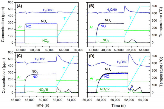 NOx adsorption experiments were conducted using 100 mg of powdered samples, sieved at 70–100 µm, and loaded in a quartz microreactor with an internal diameter of 8 mm. The outlet of the reactor is directly connected to a mass spectrometer (ThermoStar 200, Pfeiffer Vacuum GmbH, Aßlar, Germany)), a UV-analyzer specific for NO, NO2, NH3 (Limas 11 HW, ABB, Zurig, Swizzerland), and a micro gas-chromatograph (3000 A, Agilent, Santa Clara, CA 95051 United States). In a typical experiment, the sample was initially pre-treated at 500 °C for 30 min under a flow of O2 (3% v/v), CO2 (2% v/v), and H2O (2.5% v/v) (balance He) at a flow rate of 100 Ncm3/min. The sample was then cooled down to the adsorption temperature (50 °C, 80 °C, or 120 °C) without changing the gas flow composition, and at this temperature 300 ppm of NO were stepwise added to the gas mixture for 75 min. Then, the NO supply was closed, and the sample was heated under temperature programming (TPD) up to 500 °C (heating rate 10 °C/min).