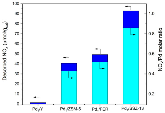 From the amounts of stored NOx, we have also estimated the adsorbed NOx/Pd molar ratio (Figure 7) under the hypothesis that all NOx are stored over Pd. In the case of the Pd/SSZ-13 sample, a value of desorbed NOx near 93 µmol/gcat was evaluated, corresponding to a NOx/Pd molar ratio of 0.86. This calls for a large utilization of Pd, thus indicating a good dispersion of the metal. The Pd/ZSM-5 and Pd/FER showed lower stored NOx/Pd values, whereas, as already stated the storage capacity for Pd/Y is negligible.