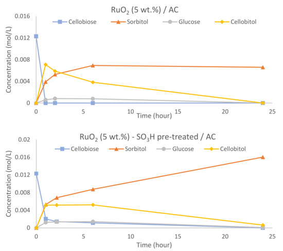 As sulfonic functions can leach and poison Ru nanoparticles, a pre-treatment under the same conditions as the catalytic tests was conducted to remove all labile functions and keep solely the sulfonic groups well grafted onto the carbon support. This type of pre-treatment has been shown in previous work to provide 116 mmol/100 g of acidity, with good results for the hydrolysis of cellobiose into glucose (98% selectivity toward glucose) [26]. XPS data of the pre-treated SO3H/AC can be found in the Supplementary Materials (S3 section). Two consecutive reactions were carried out with first the pre-treated SO3H/AC catalyst and then with the RuO2/AC catalyst.