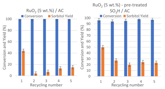 Recycling tests with monofunctional RuO2/AC and bifunctional RuO2-pre-treated SO3H/AC catalysts.