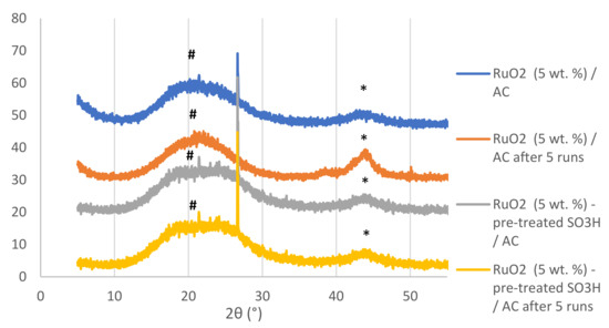 XRD analyses were also conducted on these catalysts (Figure 3). The wide peak between 12° and 28° comes from the carbon support (AC) [39]. The sharp peak at ~27 ° is probably due to graphitic C or S but cannot be ascribed to Ru species. The Ru peak is around 44° [40]. This is very low for the catalysts before the reaction because it is essentially RuO2. After the reaction, Ru was reduced and the Ru peak increased because Ru(0) is crystalline in the case of the monofunctional catalyst, but surprisingly not for the bifunctional catalyst. It seems that the presence of sulfonic functions interferes with the crystallinity of the Ru(0) domains and decreases it.