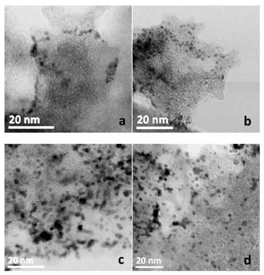 HR-TEM images were obtained for the four catalysts (Figure 4). The RuO2 nanoparticle preparation method can be adapted to control their sizes, and a nanoparticle size of 1–2 nm was targeted here [41]. The images show that the RuO2 nanoparticles have a mean size of around 1 nm, as expected. The distribution and size of the nanoparticles are the same without or with sulfonic functions (see Figure 4a,b for comparison). EDX mapping analyses were performed and confirmed the good dispersion of Ru on the carbon support (S8 section in the Supplementary Materials). When the support was functionalized by the sulfonic functions, sulfur was found everywhere on the carbon support. There was no specific area that could be identified where Ru and S were more present together. The catalysts recovered after the catalytic reaction (five runs) were also analyzed by using HR-TEM (Figure 4c,d) and EDX (S8 section in the Supplementary Materials). The TEM images show that the Ru nanoparticles were still well dispersed on the support. However, due to the high temperature during the reaction, a small increase in nanoparticle size could be observed after catalyst recovery, but the nanoparticle size was still between 1 and 2 nm. The presence of sulfur all over the support for the bifunctional catalyst after five runs was also confirmed by EDX analyses.