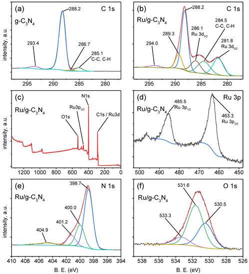 For the Ru/g-C3N4 catalyst, the C 1s/Ru 3d region has a complex structure indicating a clear peak at 281.8 eV (Figure 6b), which can be assigned—in conjunction with the Ru 3p3/2 peak at 463.3 eV (Figure 6d)—to the Ru(II)–nitrogen bond [34,35,36,37].