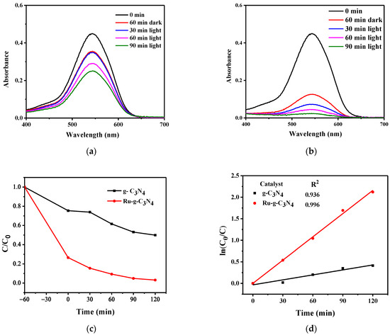 UV–Vis spectra were measured during the treatment of Cr(VI) solution (pH 2) at certain irradiation times using (a) g-C3N4 (b) Ru/g-C3N4 and kinetic curves (c,d).