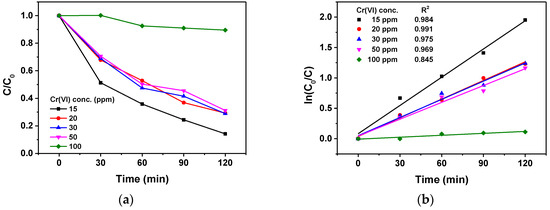 The photocatalytic efficiency of the Ru/g-C3N4 catalyst in the reduction of Cr(VI) was investigated at various concentrations (15–100 ppm) of Cr(VI) at an initial solution pH of 2.0, and 0.1 g/L of catalyst with a reaction time of 120 min (Figure 14). The photocatalytic efficiency of the reaction decreased when the initial concentration of Cr(VI) was increased, and drastically reduced with 100 ppm of Cr(VI) (to ca. 10%). This behavior is related to a large amount of Cr(VI) that is adsorbed on the surface of the photocatalyst and prevents the light absorption during the reaction. Hence, under these conditions, the specific and available surface area of the photocatalyst decreased, which resulted in lower photocatalytic efficiency. In this case, even the reaction rate (ppm/min) decreased significantly. However, at concentrations 30 and 50 ppm, the reaction rate increased compared to the case of 15 ppm because the faster capturing of CB electrons by Cr(VI) overcompensated the decreased light absorption. From a comparison based on the product of the initial concentration of Cr(VI) and the ln(C/C0) value at 120 min, the highest reaction rate was observed at 50 ppm.