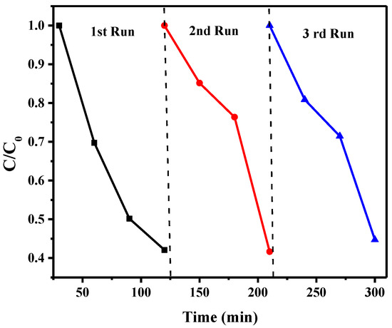 The reusability of the Ru/g-C3N4 sample was evaluated regarding its stability over three consecutive cycles (Figure 16). As Figure 16 indicates, the photocatalyst showed almost the same photodegradation activity towards 20 mg L−1 K₂Cr₂O₇ solution in all three experiments. A slight decrease in the removal efficiency may be due to a loss of catalyst during the collection after each run. Slight differences in the shape of the plot in the case second and third runs compared to the first one may probably arise from a temporary decrease of the active sites on the surface of the Ru/g-C3N4 catalyst during its collection after each run. As a consequence, the adsorption–desorption property of the reused catalyst may slightly deviate from that of the fresh one. In the second period of the irradiations, however, a regeneration of the active sites took place; therefore, no significant decrease could be observed in the photocatalytic yield after three recycling experiments, indicating the stability of the catalyst.