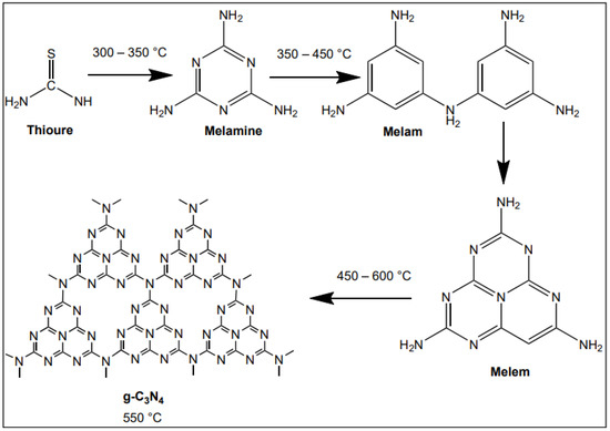 The g-C3N4 catalyst was synthesized by a simple calcination method: 3 g of thiourea in a porcelain crucible with a cover. For the calcination process, the sample was heated 25 to 550 °C at 2 °C min−1 for 4 h. At the end of the heating process, the crucible was cooled down to room temperature, and the solid sample of g-C3N4 was ground to powder and collected [52]. Samples are stored in vials and labeled with sample g-C3N4. The sample synthesis process and the schematic for plausible intermediates at different temperature ranges have been shown in Figure 17. Notably, the g-C3N4 can be synthesized by hydrothermal condensation from melamine or other triazine precursors, too. However, it was reported that the g-C3N4 synthesized from thiourea, a sulfur-containing precursor, could take advantage of a sulfur-mediated process, which improved the degree of polycondensation and polymerization of g-C3N4, thus enhancing the energy conversion efficiency [53].