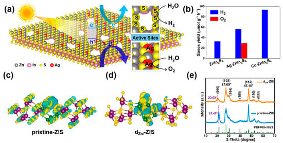 Pan et al. in 2021 reported Ag-ZnIn2S4 composite photocatalytic materials with dual defects in Ag doping and nanopores prepared by cation exchange between 2D ZnIn2S4 monolayers and Ag, achieving ZnIn2S4 photocatalytic overall water splitting without co-catalysts and sacrificial agents under visible light irradiation []. The experimental results show that Ag doping can effectively narrow the band gap, improve the light collection capacity of the catalyst, and promote photogenerated charge separation. The hydrogen yield of the composites was 56.6 μmol g−1 h−1 and the oxygen yield was 29.1 μmol g−1 h−1. The Ag-ZnIn2S4 composite has good photocatalytic activity, as shown in Figure 2a; the Ag element doping redistributes the charge; the positively charged enriched Ag adsorbs water molecules and promotes the oxygen production reaction; and the sulfur atoms suspended on the nanopores promote the hydrogen production reaction. In addition, the ultrathin 2D ZnIn2S4 monolayer narrows the migration distance and increases the photogenerated charge separation and migration rate. They also prepared Cu-ZnIn2S4 with a similar structure to Ag-ZnIn2S4 by the same method. The experimental results show that Cu doping has a stronger charge migration rate and higher hydrogen production activity, but as shown in Figure 2b, Cu doping does not enable photocatalytic all-water decomposition, which confirms that Ag doping is important for the Ag-ZnIn2S4 materials to achieve photocatalytic all-water decomposition.