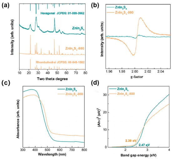 (a) X-ray diffraction (XRD) patterns of ZnIn2S4 and ZnIn2S4-800, (b) Electron paramagnetic resonance (EPR) results of ZnIn2S4 and ZnIn2S4-800, and (c) Ultraviolet–visible (UV−vis) light absorption spectra and (d) Band-gap energies of ZnIn2S4 and ZnIn2S4-800 [].