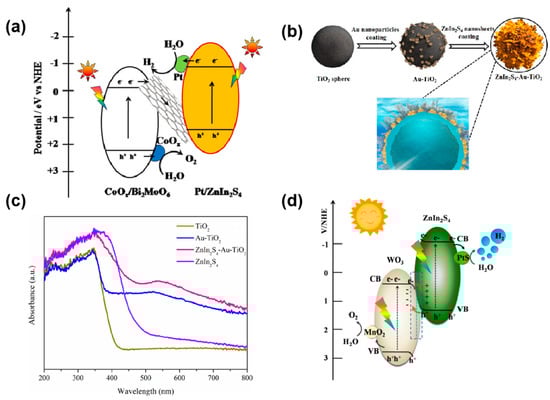 (a) Z-scheme photocatalytic water splitting systems consisting of H2-evolving photocatalyst (Pt/ZnIn2S4), O2-evolving photocatalyst (CoOx/BMO), and electron medium (RGO) []. (b) Schematic illustration of the fabrication process of the ZnIn2S4-Au-TiO2 photocatalyst: Au-TiO2 is prepared by a chemical-deposition process and ZnIn2S4-Au-TiO2 is synthesized by the solvothermal process. (c) UV-Vis diffuse reflectance spectra of TiO2, Au-TiO2, ZnIn2S4-Au-TiO2, and ZnIn2S4 []. (d) Proposed mechanism for photocatalytic overall water splitting over PtS-ZnIn2S4/WO3-MnO2 nanocomposites under visible light [].