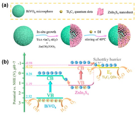 In 2020, Zhao et al. prepared BiVO4@ZnIn2S4/Ti3C2 MXene quantum dots (BV@ZIS/TC QDs) with layered core–shell structures by in situ growth combined with a two-step solvothermal strategy []. They first synthesized BiVO4 microspheres by the hydrothermal method, on which ZnIn2S4 nanosheets were grown in situ to form a hierarchical core–shell structure (Figure 5a). A solid contact surface and matching energy band structure was ensured between two semiconductors to construct the Z-scheme heterojunction, and then it was loaded with Ti3C2 MXene QDs (TC QDs) as a co-catalyst to synthesize composite material for photocatalytic overall water splitting. Material electron transfer pathways are characterized, BiVO4@ZnIn2S4 (BV@ZIS) constructs space-charge-separated all-solid z-structures, and co-catalyst TC QDs form Schottky barriers between the interfaces, effectively promoting photogenerated carrier separation and migration rates (Figure 5b). The unique layered core–shell structure of the material increases light utilization, shortens the charge diffusion distance, increases more active sites, and effectively improves the photocatalytic activity. The material achieves a hydrogen yield of 102.67 μmol g−1 h−1 and an oxygen yield of 50.83 μmol g−1 h−1 under visible-light irradiation.