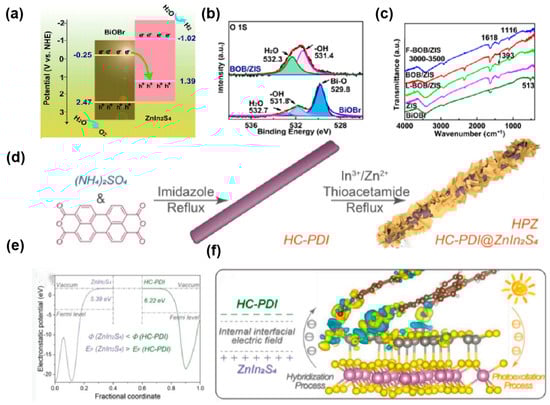 (a) Band structures of the BiOBr/ZnIn2S4 (BOB/ZIS) direct Z-scheme heterojunction; (b) X-ray photoelectron spectroscopy (XPS) spectra O 1s; (c) FTIR spectra of composite samples []. (d) Schematic illustration of HPZ synthesis, (e) Z axis potential profile of HC-PDI and ZnIn2S4. (f) Differential charge density between HC-PDI and ZnIn2S4. Zn: silver, In: purple, S: yellow, C: brown, O: red, and H: white spheres [].