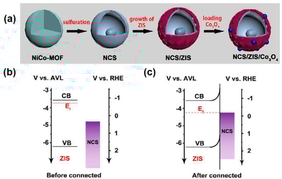 In 2021, Cai et al. synthesized a yolk–shell ZnIn2S4-based photocatalyst NiCo2S4/ZnIn2S4/Co3O4 for photocatalytic overall water splitting without sacrificial agents []. They first prepared nickel–cobalt-based metal–organic framework (MOF) materials as precursors by the solvothermal method, synthesized yolk–shell NiCo2S4 (NCS) with semi-metallic properties by sulfidation reaction and heat treatment, then grew ZnIn2S4 nanosheets in situ on the surface of NCS by low-temperature solvothermal method, and finally decorated Co3O4 nanoparticles to prepare photocatalysts (Figure 8a). The characteristic peak of NiCo-glyceric acid disappeared and shifted to NiCo2S4 when vulcanized at different vulcanization temperatures for 8 h. The precursors were vulcanized at 150, 180, and 210 °C for 8 h to form ball-in-ball hollow spheres, yolk–shell hollow spheres, and a single hollow sphere, respectively, with the yolk–shell structure providing more active sites and improving the photocatalytic activity of the material. As shown in Figure 8b,c, based on the energy band diagrams of ZnIn2S4 and NCS as well as the energy band diagrams after contact, it is shown that the semi-metallic NCS forms a Schottky-specific heterojunction with ZnIn2S4 to facilitate charge transfer. The photocatalyst has a unique yolk–shell structure that locates reduction and oxidation sites on the inner and outer surfaces of ZnIn2S4, respectively, allowing for directional charge separation, inhibition of inverse reactions, and providing more active sites.