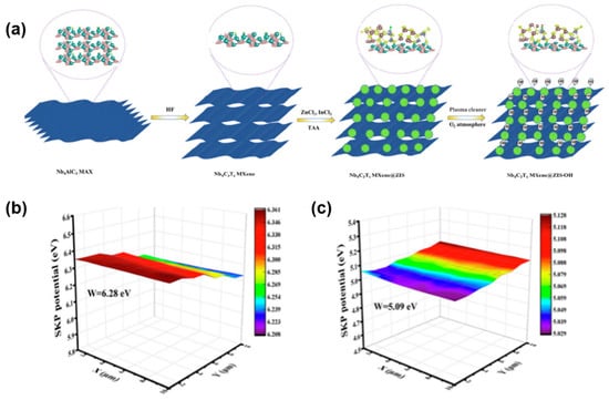 (a) Schematic illustration of the synthetic process of Nb4C3Tx MXene@ ZnIn2S4-OH sandwich composite, (b) Scanning kelvin probe (SKP) maps of (c) Nb4C3Tx MXene and ZnIn2S4 [].