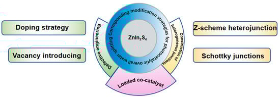Although ZnIn2S4 has many advantages, in practical applications, ZnIn2S4-based photocatalysts suffer from difficulties in achieving one-component photocatalytic overall water splitting or low photocatalytic overall water splitting efficiency, mainly due to the slow photo-generated charge separation and migration efficiency and weak solar energy utilization [,,]. Therefore, appropriate modification strategies such as elemental doping, vacancy engineering, the construction of heterojunctions, and the loading of co-catalysts are required to improve the performance of ZnIn2S4-based photocatalyst materials.