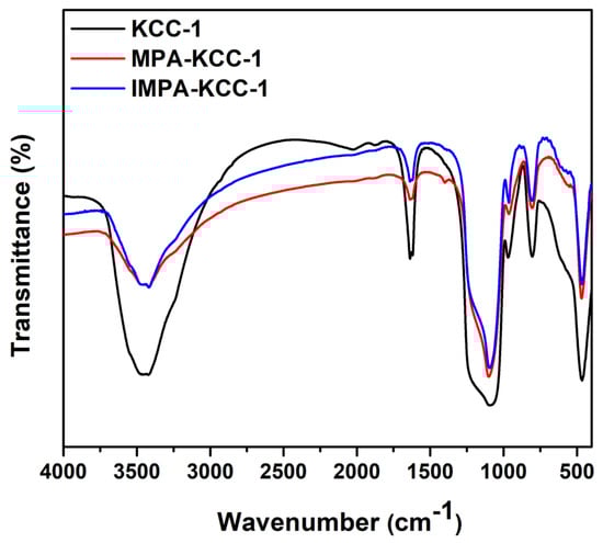 The FT-IR spectra of the KCC-1 and MPA encapsulated and impregnated KCC-1 are shown in Figure 2. The broad peak at 3100 to 3600 cm−1 was assigned to the water molecules absorbed on the surface of the silica KCC-1. After the encapsulation and impregnation of MPA molecules with KCC-1 silica support, the broad peak was reduced due to the reduction of the absorbed water molecules or the interaction of –OH groups with loaded MPA molecules. The heteropoly acids of the MPA molecule bonds are generally located at 1060, 970, 875, and 760 cm−1, corresponding to the stretching vibration of v(P-Oa), v(M-Od), v(M-Ob-M), and v(M-Oc-M) and also confirm the Keggin formations (M represents the Mo metal ions) [35]. Notably, most of the bands of the heteropoly anions overlapped with the SiO2 peaks and create difficulties in distinguishing the peaks between the heteropoly anions and SiO2.
