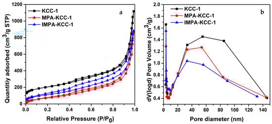 Figure 3a,b depict the N2 sorption isotherms and BJH pore size distribution of the KCC-1, MPA-KCC-1, and IMPA-KCC-1 catalysts, and Table 1 provides the associated textural properties. The observed Type IV isotherms with H3 hysteresis loops in all synthesized materials can specify the mesoporous nature of those materials and can also confirm the formation of the mesoporous structures with large pores [36]. KCC-1, MPA-KCC-1, and IMPA-KCC-1 each had a surface area of 523, 320, and 380 m2/g, respectively (Table 1). In Figure 3b, the BJH pore size distribution (Figure 3b) adsorbed the volume in the range of 0.4 to 0.95 P/Po and was observed in all the catalysts, which confirms the presence of a large pore size distribution. The encapsulation strategy decreased the BET surface of MPA-KCC-1, (320 m2/g) and pore volume (0.65 cm3/g).