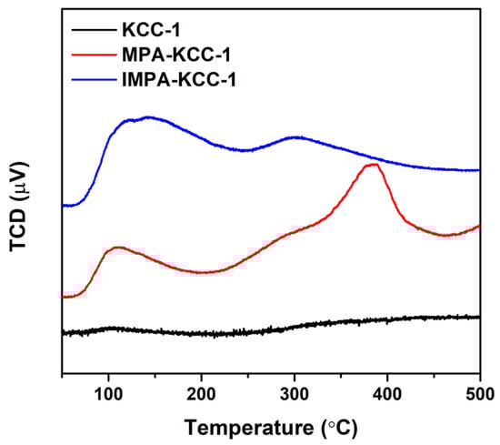 The prepared samples’ total acidity was evaluated using NH3-TPD, and their desorbed ammonia profiles are displayed in Figure 4. The total acidity of the pure siliceous KCC-1 was 0.022 mmol/NH3, which is negligible with the comparison of the total acidity of the MPA-KCC-1 and IMPA-KCC-1 catalysts (the acidic amounts are displayed in Table 1). In the NH3-TPD profile, the weak and moderate acidic sites of the MPA-KCC-1 and IMPA-KCC-1 can be observed at 80 to 150 °C and at 300 to 450 °C. The acidity of the IMPA-KCC-1 catalyst appears to be high, which is due to the impregnation method, which accommodated more heteropoly anions in the silica matrix as well as on the material’s surface, resulting in a high acidic strength. The observed total acid value of the MPA-KCC-1 catalyst was considerably lower, indicating that its heteropoly anion was lost during the catalyst wash after synthesis [33].