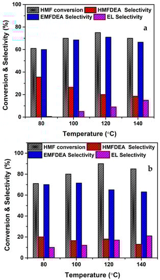 The prepared MPA encapsulated and impregnated KCC-1 catalysts were tested in the microwave etherification of 5-HMF with ethanol. Initially, the MPA-KCC-1 and IMPA-KCC-1 catalytic activities were evaluated for the 5-HMF etherification with ethanol at different temperatures for 30 min; the subsequent results are shown in Figure 7. The main products were 5-(hydroxymethyl) furfural diethyl acetal (HMFDEA), 5-(ethoxymethyl)furfural diethyl acetal (EMFDEA), and minor amounts of ethyl levulinate (EL) formations were noticed. In the temperature study, the 5-HMF conversion was increased until 120 °C, then dropped in at 140 °C due to the reverse reaction of HMFDEA to 5-HMF, where the EMFEDA and ethyl levulinate (EL) selectivity were increased [37]. The HMFDEA selectivity was high at a lower temperature of 80 °C and as the temperature increased, the selectivity of HMFDEA was reduced, while the EMFDEA selectivity increased gradually to 71% at 120 °C. Further, at a higher temperature of 140 °C, the EMFDEA slightly decreased instead of the EL selectivity increasing. The temperature study reveals that a high temperature favors more EL product formation. The maximum conversion of 5-HMF and EMFDEA selectivity was obtained at 120 °C and the temperature was considered the optimum for other parameter analysis. The IMPA-KCC-1 catalyst showed a higher conversion and selectivity due to its high total acidity (0.385 mmol NH3/g, Table 1). The surface area of both the MPA-KCC-1 and IMPA-KCC-1 catalysts was almost the same, which seemed to have no impact on the catalysis. Here, the acidity of the catalyst and the temperature of the reaction play an important role. Even though the acidity of the IMPA-KCC-1 is higher than MPA-KCC-1, it was not considered for further studies because larger amounts of heteropoly anions were leached during the reaction, which was confirmed through ICP-OES analysis of the reacted solution. In our previous study, we observed the same effect for tungstophosphoric acid encapsulated KCC-1 silica for carbohydrates to 5-HMF conversion in a microwave assisted reaction condition [32]. The catalytic activity of pure molyptophosphoric acid was evaluated in 5-HMF with ethanol at 120 °C for 30 min with a microwave power of 100 W. The 5-HMF conversion was 100% but the total yield of products was 40 to 42%, instead of more humin products being observed. Due to the high acidity of the molyptophosphoric acid, more humin products were formed compared with heterogeneous MPA-KCC-1 and IMPA-KCC-1.