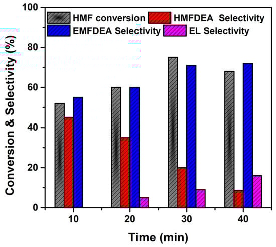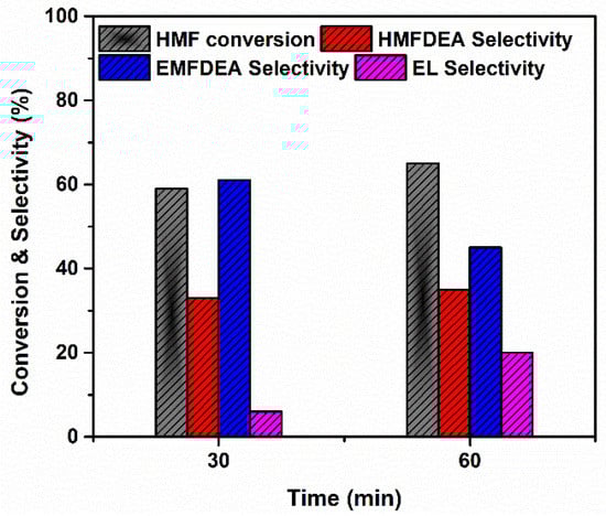 To compare the effect of microwave heating, we evaluated 5-HMF etherification with ethanol in conventional heating using an oil bath with a controlled temperature at 120 °C in an autoclave for 30 and 60 min, with the corresponding results shown in Figure 8. The autoclave was kept in the oil bath after reaching the desired temperature. After 30 or 60 min the autoclave was cooled in cold water immediately. The 5-HMF conversion was 59% and the selectivity of HMFDEA, EMFDEA, and EL was 33%, 61%, and 6%, respectively, for 30 min. However, the conversion was 65% after a 60 min reaction and the EL selectivity increased to 20%. It seems that conventional heating also favors the 5-HMF conversion with a longer time compared with microwave heating. As the time increased, there was noted the formation of humin or charred products.
