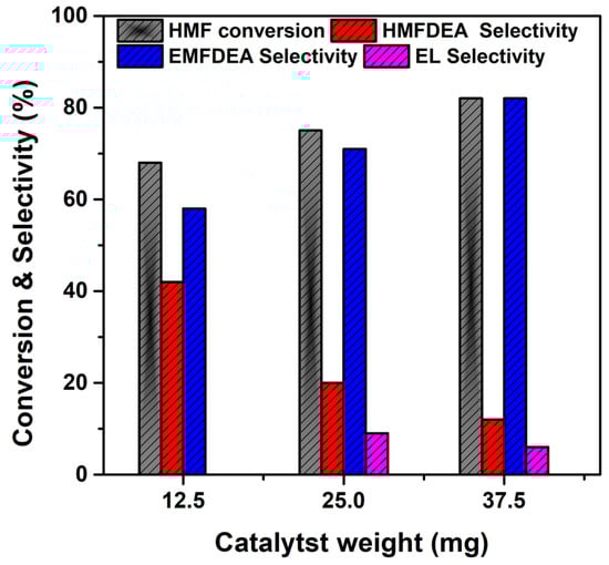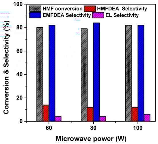 The effect of time on the 5-HMF conversion and the corresponding selectivity was evaluated at 120 °C; the results are shown in Figure 9. The 5-HMF conversion was increased as the time increased and the selective products of HMFDEA and EMFDEA were also increased. After 30 min, the 5-HMF conversion was decreased due to the reverse reaction of HMFDEA to 5-HMF. The maximum conversion of 75% 5-HMF with 20%, 71%, and 9% selectivity of HMFDEA, EMFDEA, and EL were formed, respectively, at 30 min. Further, the effect of the MPA-KCC-1 catalyst was studied at the different catalytic amounts at the optimum temperature of 120 °C; the results are displayed in Figure 10. The conversion of 5-HMF was 68%, 71%, and 82% for the catalytic amounts of 12.5, 25, and 37.5 mg of MPA-KCC-1, respectively. It reveals that as the catalytic amount increased, the selectivity of HMFDEA reduced from 42% to 12%, whereas the EMFDEA selectivity rose from 58% to 82%. These results suggest that an increase in catalytic amounts improves the EMFDEA selectivity due to more availability of acidic sites. In addition, the efficiency of microwave power was analyzed with varying microwave power ranges from 60 W to 100 W for the MPA-KCC-1 catalyst; the results are shown in Figure 11. The higher catalytic amount (37.5 mg) of MPA-KCC-1 was taken for different microwave power analyses and the reaction was carried out at 120 °C as the optimum temperature. It seems the different microwave powers had no great influence on the conversion of 5-HMF and the selectivity.