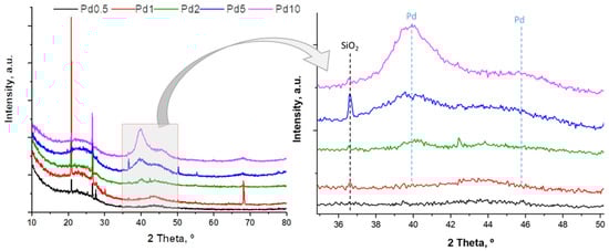 The signature of the commercial activated carbon is visible in all the samples, presenting two halos at around 23 and 43° 2θ, corresponding to (100) and (002) carbon diffractions, respectively, and associated with the random stacking of graphite sheets. In addition, some sharp diffractions are detected and attributed to the presence of mineral quartz and cristobalite SiO2 phases []. This silicon oxide phase is a mineral residue that is present in the commercial activated carbon sample obtained during its production. The presence of metallic Pd is suggested by the diffractions observed at around 40 and 46° 2θ (JCPDS 00-046-1043), which are hardly visible at low loadings but of significant intensity for the Pd 10 sample. Although the intensity of diffractions increases with metal loading, the broad diffractions suggest a low average particle size for all the samples.