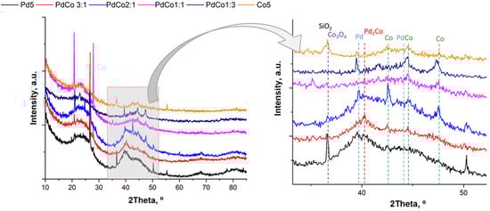In general, Pd particle size seems to decrease (suggested by the disappearance of Pd diffraction) with Co fraction increase. Nevertheless, this statement must be confirmed via microscopy, taking into account the fact that at the highest Co loading, the XRD is controlled by the cobalt phases, and in some samples, the formation of Pd2Co is indicated.