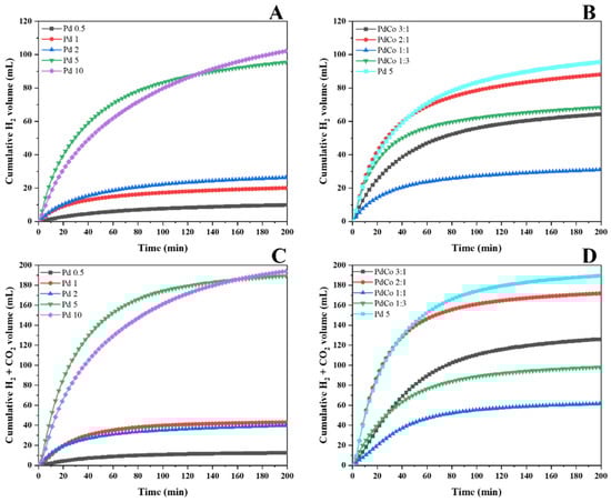 Cumulative hydrogen and total gas (H2 + CO2) production as a function of (A,C) Pd loading and (B,D) Co presence.