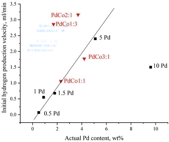 It appears that hydrogen production increases with Pd loading (Figure 5A) to a certain value, with the highest charges being practically equivalent in terms of the total hydrogen production. The initial hydrogen production velocity (measured during the first minutes of the reaction) increases with the Pd charge (Figure 6), with the 10% sample far from showing a linear dependency. The lower initial hydrogen production for the Pd 10 sample, in comparison with the Pd 5 one for the same global production, suggests a different availability of active sites. Indeed, the highest loading sample presents a larger average particle size, indicating lower Pd surface availability. The presence of linear dependency suggests that the initial velocity of the reaction depends exclusively on the state of the active surface (dispersion, metal distribution), while the total hydrogen production responds to the total Pd loading (Figure 5A,B). The monometallic Co is inactive (not shown) in these particular FAD conditions, but its presence clearly influences Pd behavior in the bimetallic samples. Some metal–metal synergy can be perceived in the PdCo 2:1 and PdCo1:3 samples (the second and third samples in terms of the total hydrogen production in Figure 5B). The formation of the Pd2Co phase or the configuration of the Pd surface with more Co/Co3O4 sites appears to influence the initial hydrogen production velocity, the latter being dependent on formic acid adsorption and the products’ desorption behavior. It was reported that formic acid interaction with CoOx leads to the formation of metal formate [], but its decomposition leaves free metal instead of a metal oxide surface. Moreover, the reaction on the Co surface is reported to occur in a mechanism in which the surface formate does not participate in the rate-determining step, in contrast to Pd []. One suspects that the presence of metallic Co particles changes the Pd’s behavior, leading to a catalyst with high hydrogen production for a low Pd content.