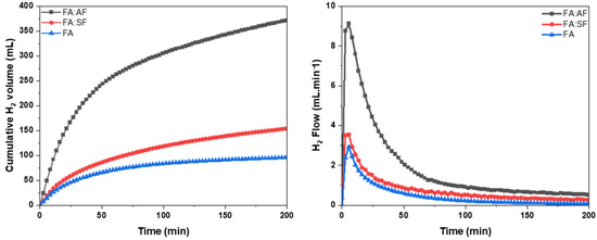 The cumulative hydrogen and total gas production for both series (mono- and bimetallic catalysts) are presented in Figure 5. Only CO2 and H2 (Figure 5A,C) were detected during the reaction and represent the total gas production (Figure 5B,D). No CO was observed due to the inhibition of the dehydration reaction in the aqueous phase. The H2/CO2 ratio remained close to 1 throughout the total time in the stream.