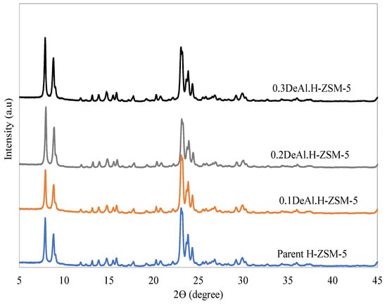 The XRF result was reported in terms of SiO2/Al2O3 molar ratio, as depicted in Table 1. The SiO2/Al2O3 ratio of the parent zeolite increased slightly after the acid leaching, indicating a mild dealumination. There was no significant difference in the Al content regarding the concentration of nitric acid solution used (0.1–0.3 M). This may be attributed to the recalcitrant nature of the zeolitic framework of H-ZSM-5 zeolite to a low concentration of acid solution [23]. Triantafillidis et al. observed a decrease in the Al2O3 content by only 7 wt% after the dealumination of commercial H-ZSM-5 (SiO2/Al2O3 ratio = 27) with 1.5 M HCl at 90 °C for 24 h [18]. The XRD analysis also confirmed that the typical MFI structure of the parent H-ZSM-5 was retained after the dealumination process using different concentrations of acid solution (Figure 1). The modified samples had the same crystallinity as the pristine commercial H-ZSM-5 zeolite (Table 1).