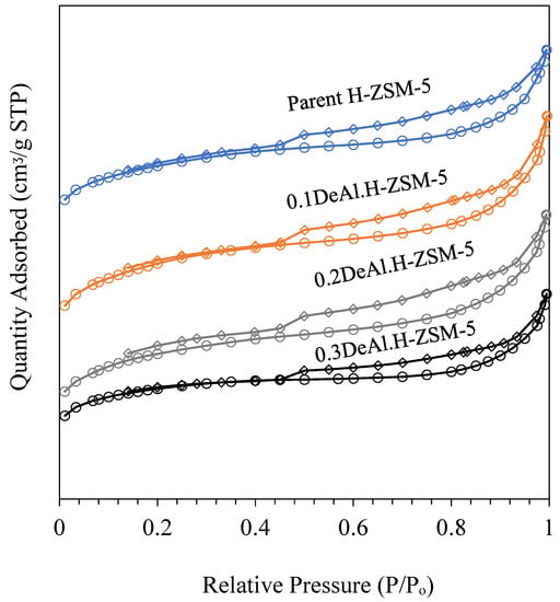 N2 adsorption–desorption isotherms of parent and dealuminated H-ZSM-5 catalysts. (Symbols: ⃝ = adsorption data and ⃟ = desorption data).
