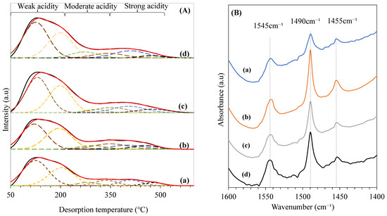 (A) NH3-TPD profiles and (B) Py-FTIR spectra of (a) parent H-ZSM-5, (b) 0.1DeAl.H-ZSM-5, (c) 0.2DeAl.H-ZSM-5, and (d) 0.3DeAl.H-ZSM-5.