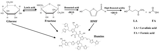 - Jung, D.; Körner, P.; Kruse, A. Kinetic study on the impact of acidity and acid concentration on the formation of 5-hydroxymethylfurfural (HMF), humins, and levulinic acid in the hydrothermal conversion of fructose. Biomass Convers. Biorefinery 2021, 11, 1155–1170. [Google Scholar] [CrossRef]