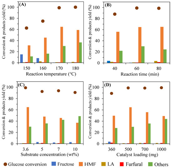 Effects of (A) reaction temperature, (B) reaction time, (C) substrate concentration, and (D) catalyst loading in the conversion of glucose to HMF over 0.1DeAl.H-ZSM-5 (central reaction conditions: catalyst loading, 500 mg; glucose concentration, 3.6 wt%; reaction temperature, 170 °C; reaction time, 60 min.